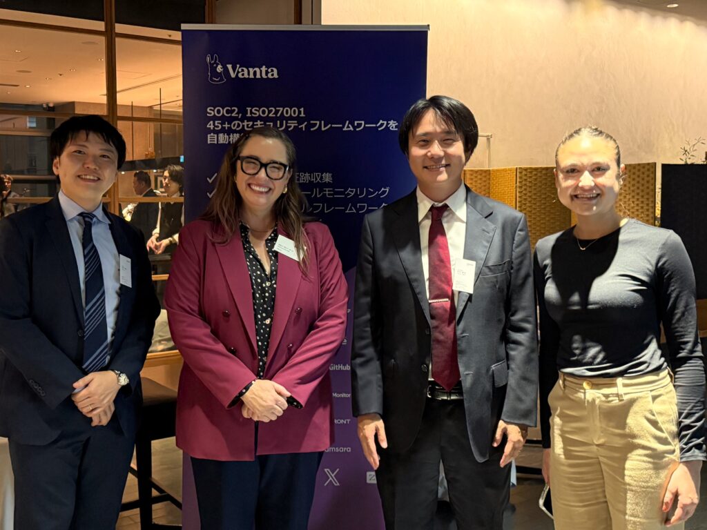 当日は、Vanta社のCRO(Chief Revenue Officer)であるStevie Case氏と、SOC2をはじめとする情報セキュリティ・コンプライアンスの現状と今後の展望について意見交換を行いました。